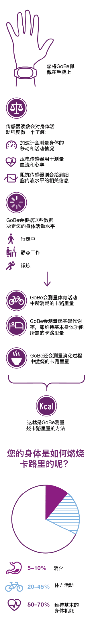 GoBe使用FLOW™技术,将加速计和心率传感器的数据结合先进算法,测量所燃烧的卡路里数。GoBe使用加速计来测量活动情况和身体动作。传感器可以计算您的步数以及行走距离。另外,还使用脉搏传感器来测量心率,这样便可以了解到您什么时候在活动,什么时候不在活动。
