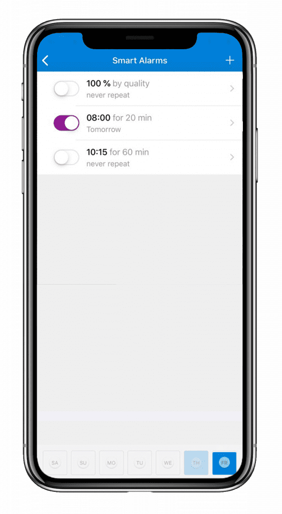 You can set your GoBe to wake you up at the ideal point of your REM cycle. You simply need to set a preferred wakeup time, and GoBe will track your sleep for the right moment from 0 up to 60 minutes to the set time. (The tracking time interval is also up to you). If REM occurs during this interval of your choice, GoBe will immediately wake you up with soft vibrations. However, if REM does not occur during this time slot, GoBe will wake you up at the initial set time. For example, if you set your alarm for 7 AM and the tracking time interval chosen is 30 minutes, from 6:30 AM GoBe will start to monitor for a REM state to ensure the freshest wake up experience.
